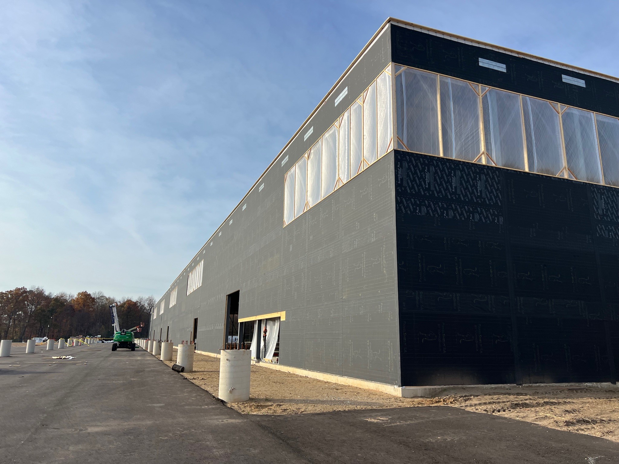 The Amazon DII5 delivery station features a mass timber structure including glulam beams and cross-laminated timber panels, creating a low-carbon, sustainable facility. Over 75,000 sq.ft. of PanelShield SA was installed on the mass timber walls to provide a fully adhered, vapor-permeable air barrier. An additional 60,000 sq.ft. of SlopeShield Plus SA was installed on the awnings of the facility.